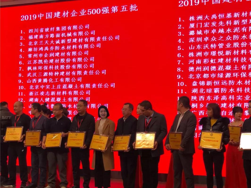 2019年12月9-11日,由中国建筑材料企业管理协会主办的“2019中国建材企业发展论坛暨2019中国建材500强系列活动发会”在北京召开。我公司受邀参会并荣获“2019中国建材企业500强”荣誉。